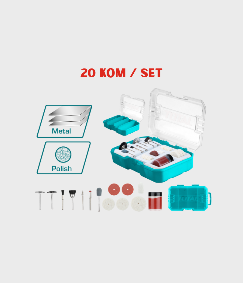 Set pribora za mini brusilicu Total TAKMG6020 je set od 20 dodataka za čišćenje i poliranje, dizajniran za korištenje s raznim mini bušilicama ili višenamjenskim rotacijskim alatima.