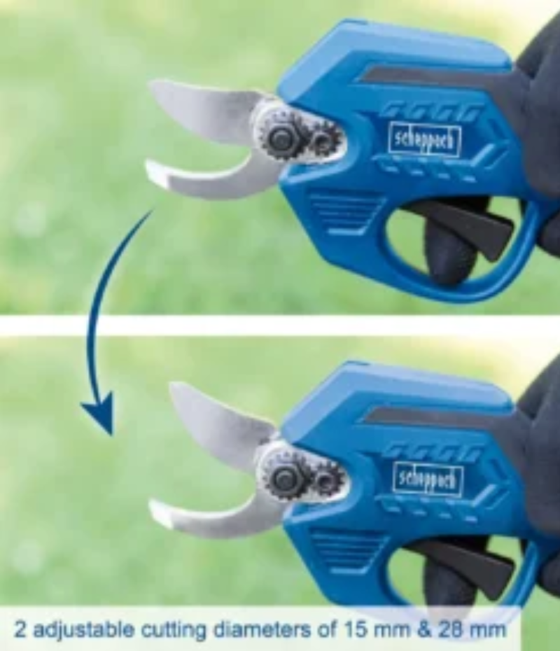 - Podešavanje debljine rezanja: Makaze posjeduju dvopoložajni prekidač koji omogućava brzo prebacivanje između sječe do 15 mm i maksimalne debljine do 28 mm, ovisno o potrebi.