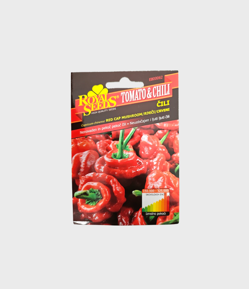 Sjeme čili paprike Red Cap Mushroom crveni od proizvođača Royal Seeds (Tomato & Chili Line) je popularna, blaga do srednje ljuta sorta čilija, cijenjena zbog svog jedinstvenog oblika gljive ili zvona i svestranosti u pripremi jela.