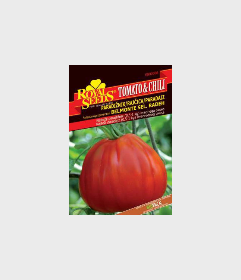 Sjeme paradajza Belmonte Sel. Radeh od proizvođača Royal Seeds (Tomato & Chili Line) je izuzetno popularna, tradicionalna, visoka (indeterminantna) sorta, cijenjena zbog svojih ogromnih, mesnatih plodova, odličnog okusa i svestranosti.